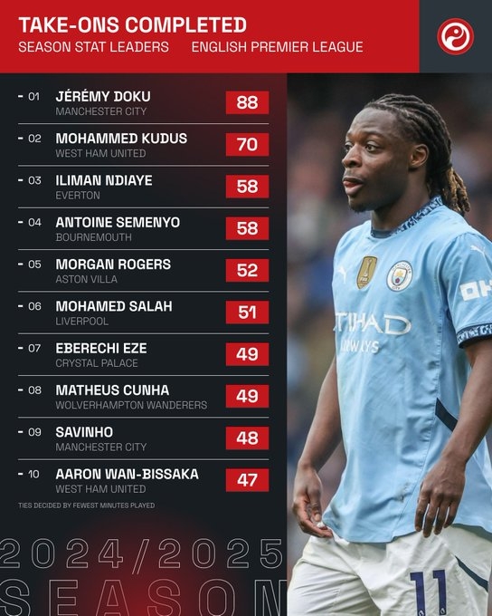 本赛季英超成功过人榜:多库88次独自领跑,萨拉赫、萨维尼奥在列