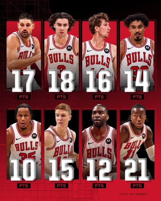 2025-10-28 17:17:00集体发挥&助队开季3连胜!公牛官推晒八人得分上双数据海报