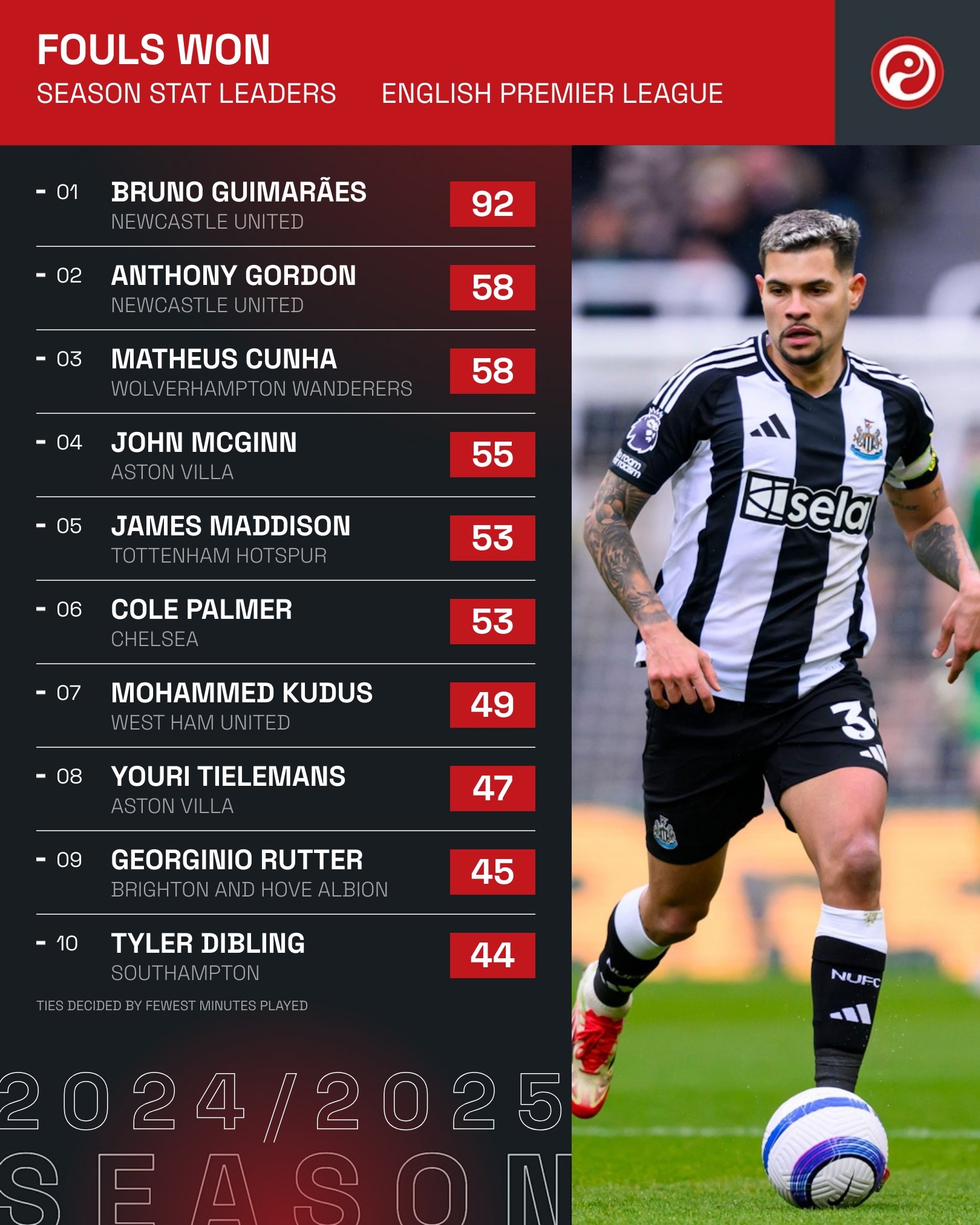 本赛季英超球员被犯规次数榜:吉马良斯居首,麦迪逊、帕尔默在列